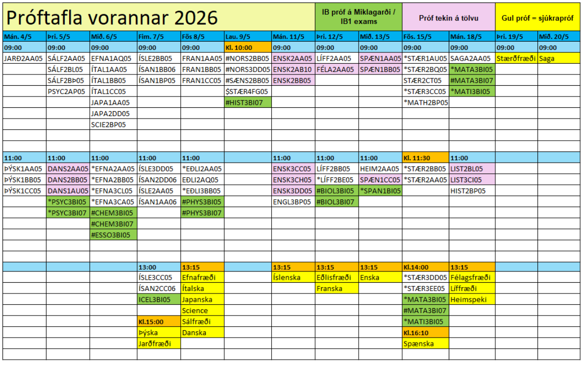 Próftaflan hefur verið opnuð á Innu og hana má jafnframt finna á heimasíðu skólans. Athugið að ef þið eruð skráð í tvö próf á sama tíma þurfið þið að sækja um að fá taka annað sem sjúkrapróf. Eins megið þið sækja um að taka sjúkrapróf í einu fagi ef þið eruð skráð í tvö próf á sama degi. Sækja þarf um tilhliðrun á próftöflu fyrir 27. mars. Nemendur sem telja sig þurfa sérúrræði eins og t.d. lituð blöð, ræða um það við náms- og starfsráðgjafa skólans.