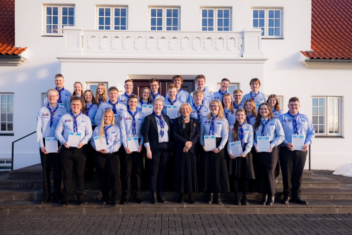 Skátarnir sem hlutu forsetamerkið, ásamt Hörpu Ósk Valgeirsdóttur skátahöfðingja og MH-ingi, og frú Höllu Tómasdóttur forseta Íslands.