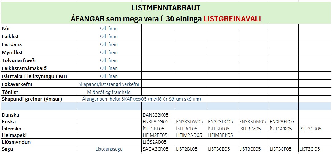 Ýmsir áfangar koma til greina sem blanda af listgreinum (30 einingar):