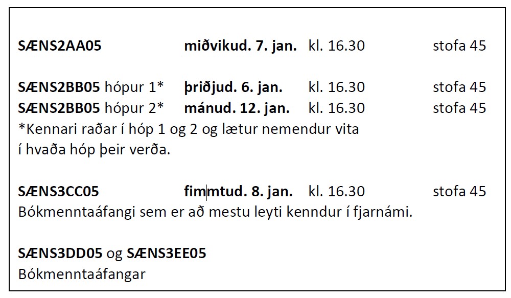 Kennsla hefst þriðjudaginn 6. janúar 2026 og mikilvægt er að allir mæti í fyrsta tíma samkvæmt eftirfarandi stundatöflu: