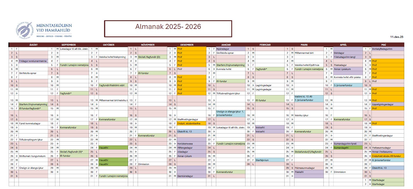Skóladagatal skólaársins 2025-2026 er hér og ef eitthvað óvænt kemur upp á þá áskilur skólinn sér rétt til að breyta skóladagatalinu.