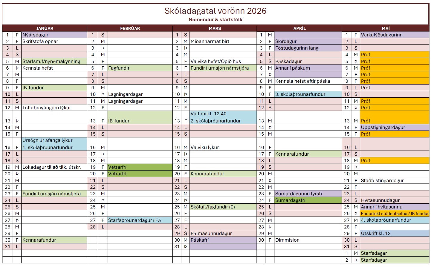 Skóladagatal vorannar 2026 er hér fyrir neðan.  Ef eitthvað óvænt kemur upp á áskilur skólinn sér rétt til að breyta skóladagatalinu.